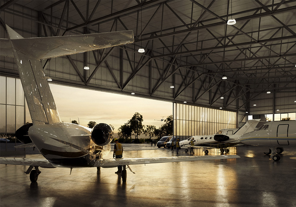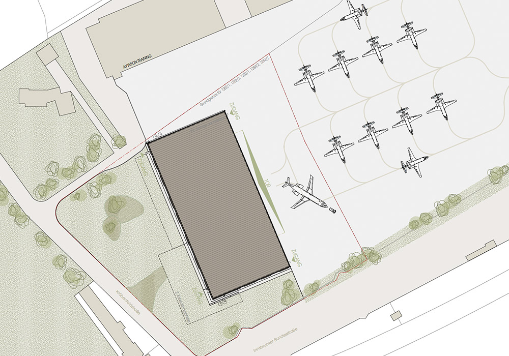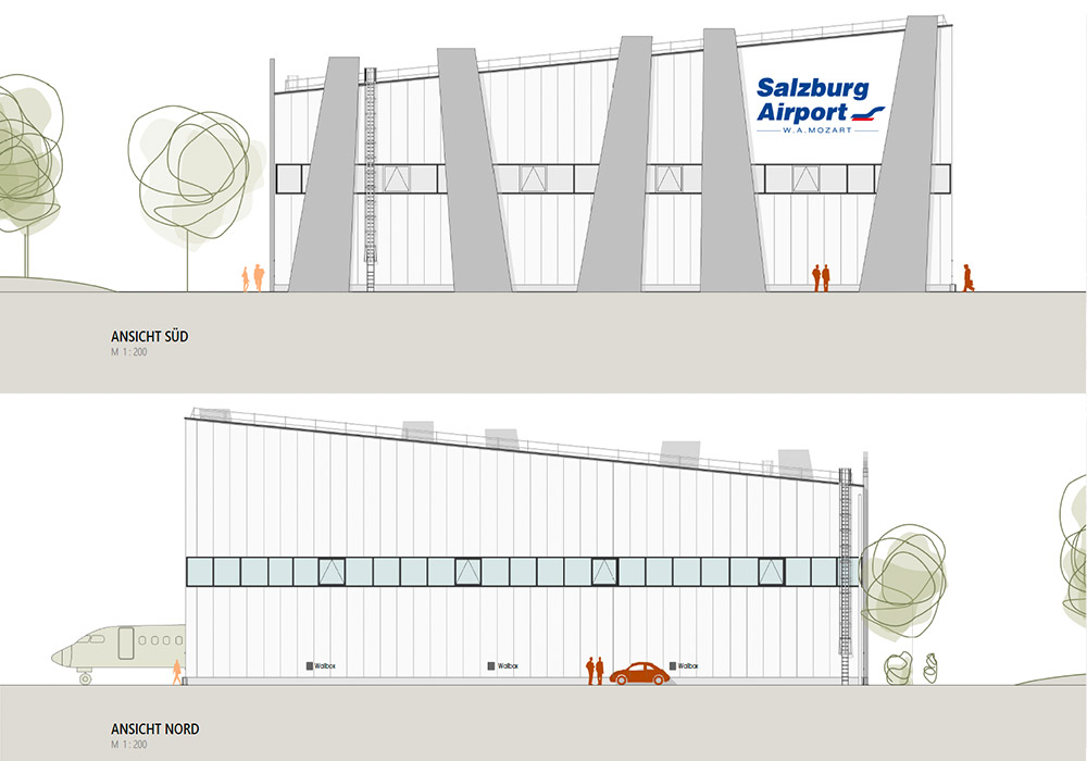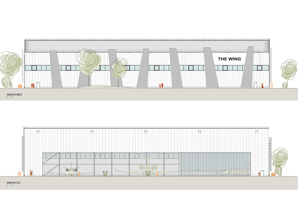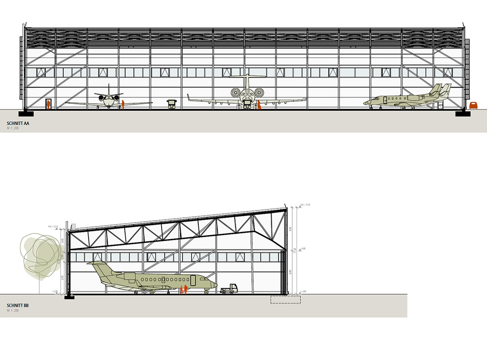 Der Entwurf vereint funktionale Anforderungen mit einer klaren, technisch inspirierten Formensprache. Als große, freitragende Halle konzipiert, bietet das Gebäude maximale Flexibilität für Abstellen und Warten von Business Jets. Das Tragwerk besteht aus einem offen sichtbaren Stahlfachwerk, das durch seine statische Optimierung große Spannweiten ohne innere Stützen ermöglicht.